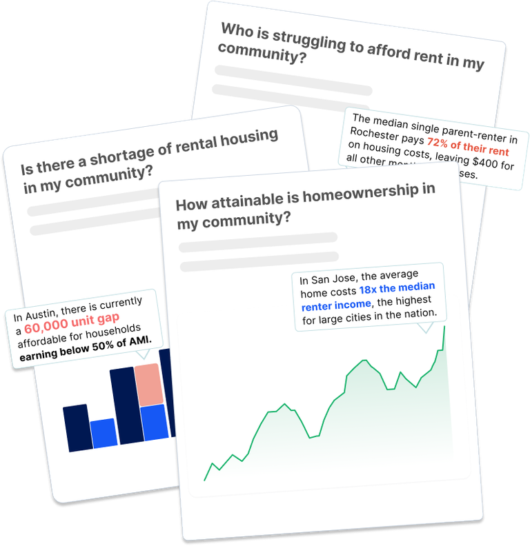 We have packed nearly 50 years of real estate, economic development, and housing policy expertise into powerful digital tools and services to help you understand, communicate, and respond to the housing crisis in your community.